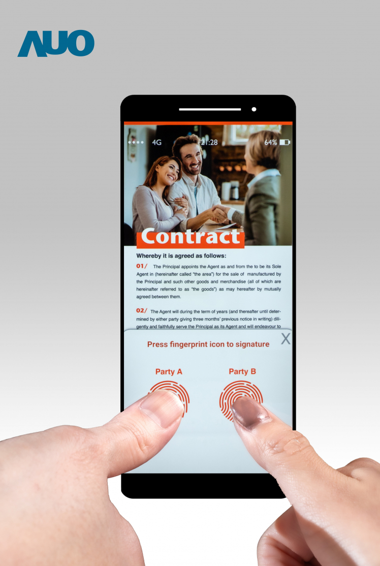 TFT Fingerprint Scanning Sensor with Ultra-high Pixel Density More Rigorous Identity Authentication Achieved by Combination of Heartbeat Detection As the security control of money flows becomes increasingly strict, identity authentication relying on a single fingerprint reader is no longer sufficient. This time, AUO will present the unique ultra-thin LTPS TFT optical fingerprint sensing module, with a sensing area of up to 2.9-inch, integrated under OLED panel and a 6.4-inch LCD panel incorporating finger recognition, touch and display functions. Besides the application of in-cell touch technology and a three-in-one integrated IC, the 6.4-inch LCD panel breaks through the limits when integrating CMOS image sensor structure to existing panels to offer a large customized sensing area of up to 50mm x 50mm. Both technologies support multi-finger authentication and are exceptionally ideal for financial transactions, as they can substantially improve the security of biometric recognition. In the meantime, AUO will also demonstrate a TFT optical fingerprint sensor with the world’s highest pixel density(*) up to 1000PPI, which can not only clearly recognize the fingerprints of delicate newborn baby fingers, but also detect the heartbeat through the slightest grayscale change of fingertip pulse to achieve a more accurate identity authentication and significantly improved security and anti-counterfeiting level.